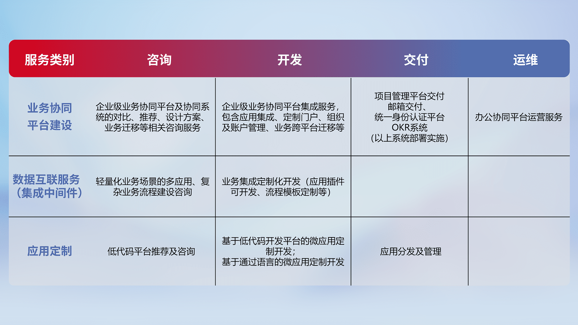 针对钉钉、、企微、、、、IDaas等平台级产品提供产品的规划、、、、方案、、交付、、、、定制化开发等服务,,实现如统一协同办公、、、、智能客户服务、、、混合会议管理、、、智能数据查询、、等业务场景,,实现数字化转型。。。