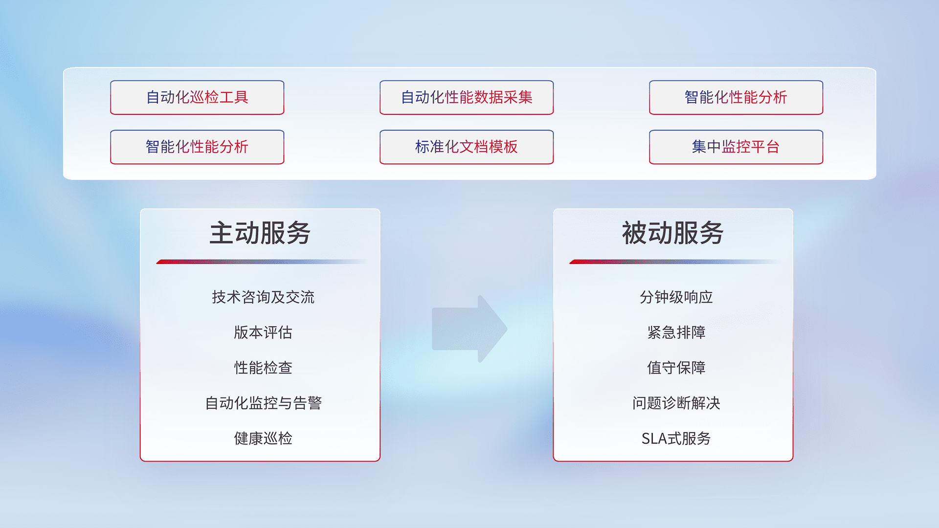 智能化工具和标准化文档,,,,保障服务质量,,,,提供主动服务(包含技术咨询、、版本评估、、、性能检查、、、自动化监控与告警、、、、健康巡检)和被动服务包含(分钟级响应、、、紧急排障、、、、值守保障、、、问题诊断解决、、、、SLA服务)。。。